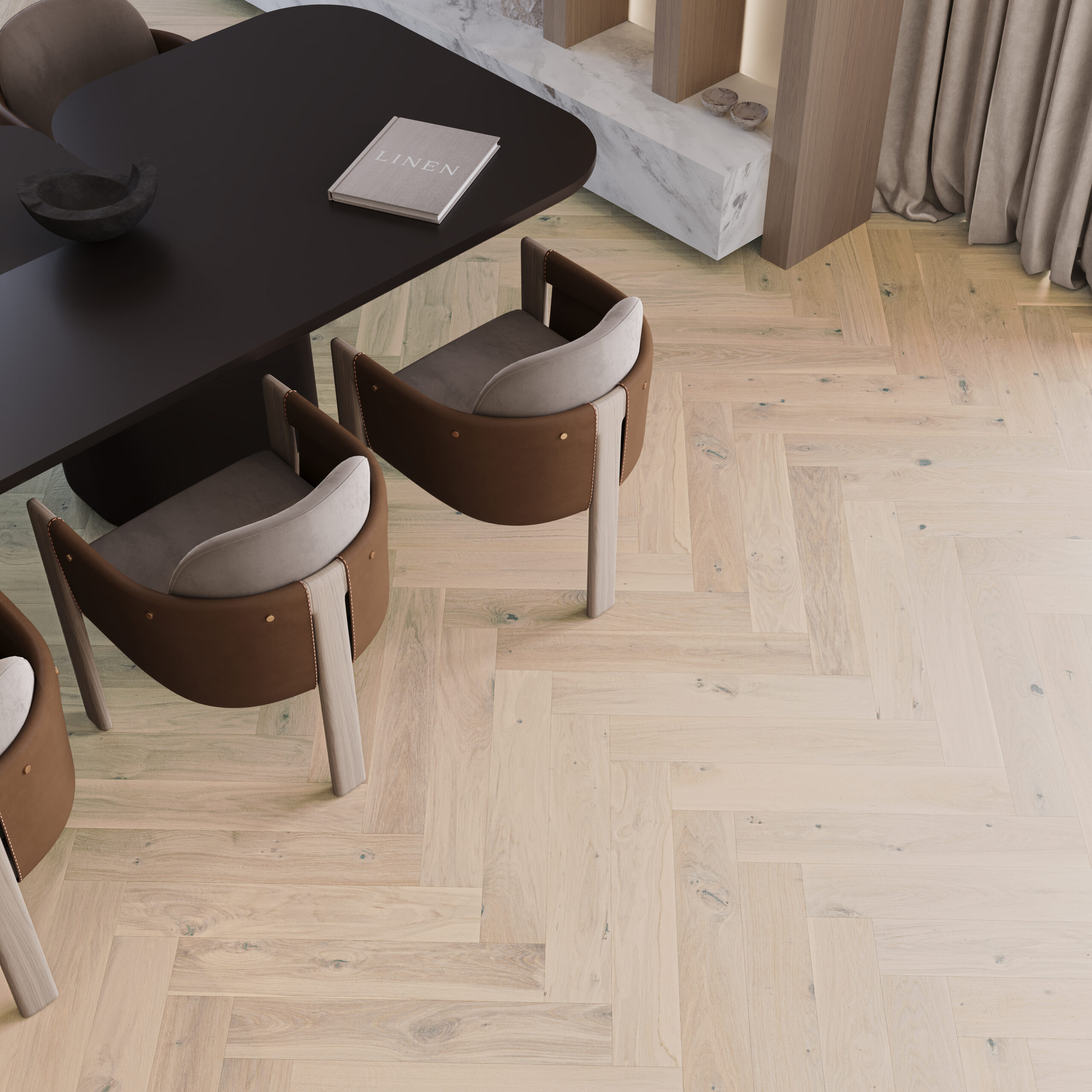 1-lamelová dubová podlaha s jemnou, krémovo-bielou farbou. Dosky zušľachtené kartáčovaním a chránené matným lakom.