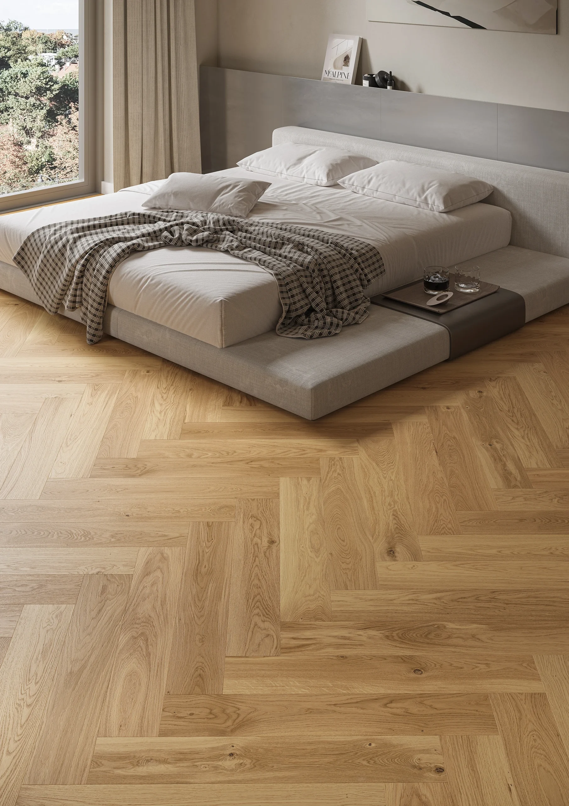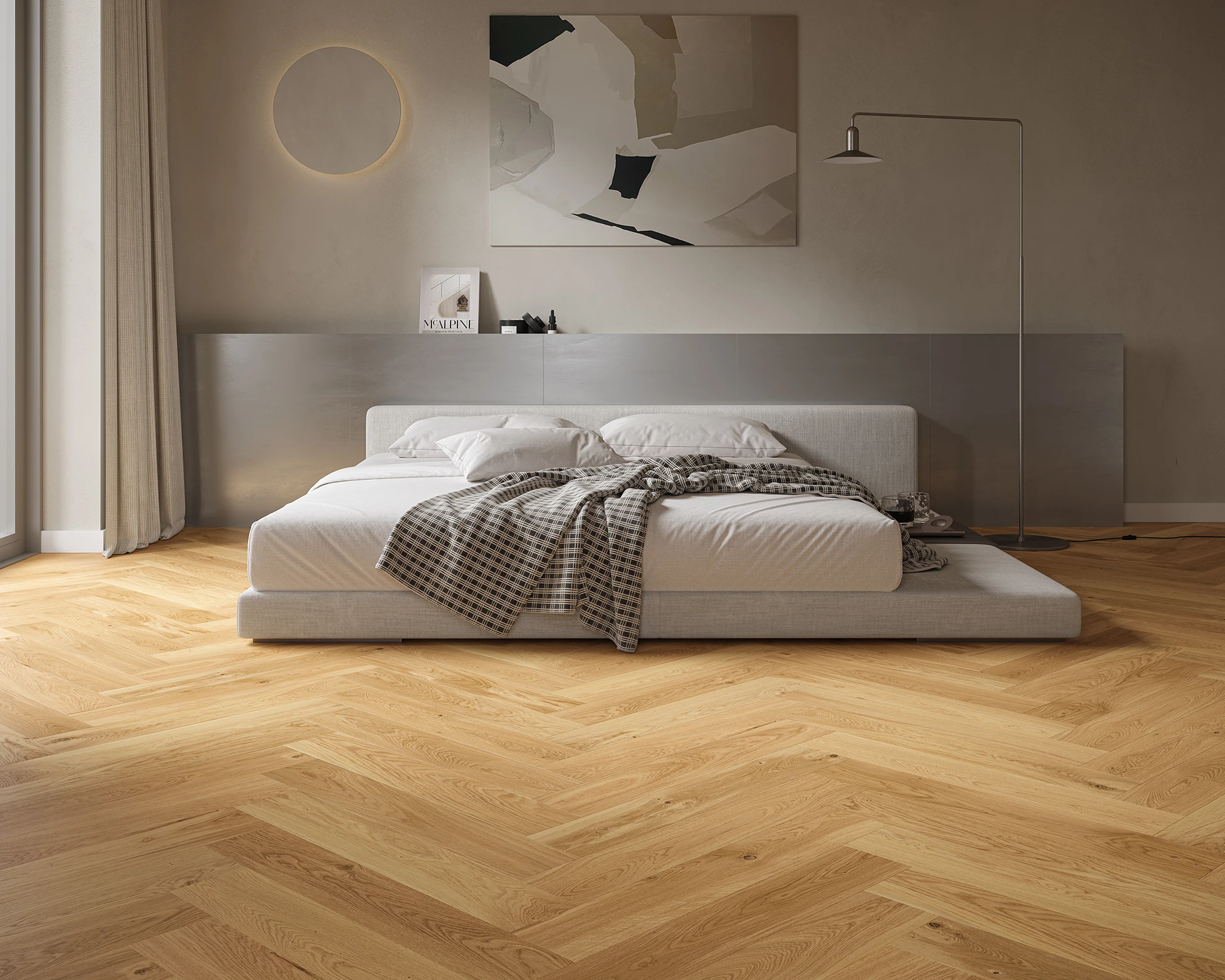 Caramel herringbone je zložená z brúsených dosiek s V špárou, čo umocňuje dojem ušľachtilej, tradičnej dubovej podlahy. Ako povrchová úprava bol použitý matný lak.