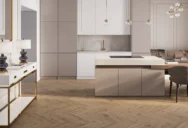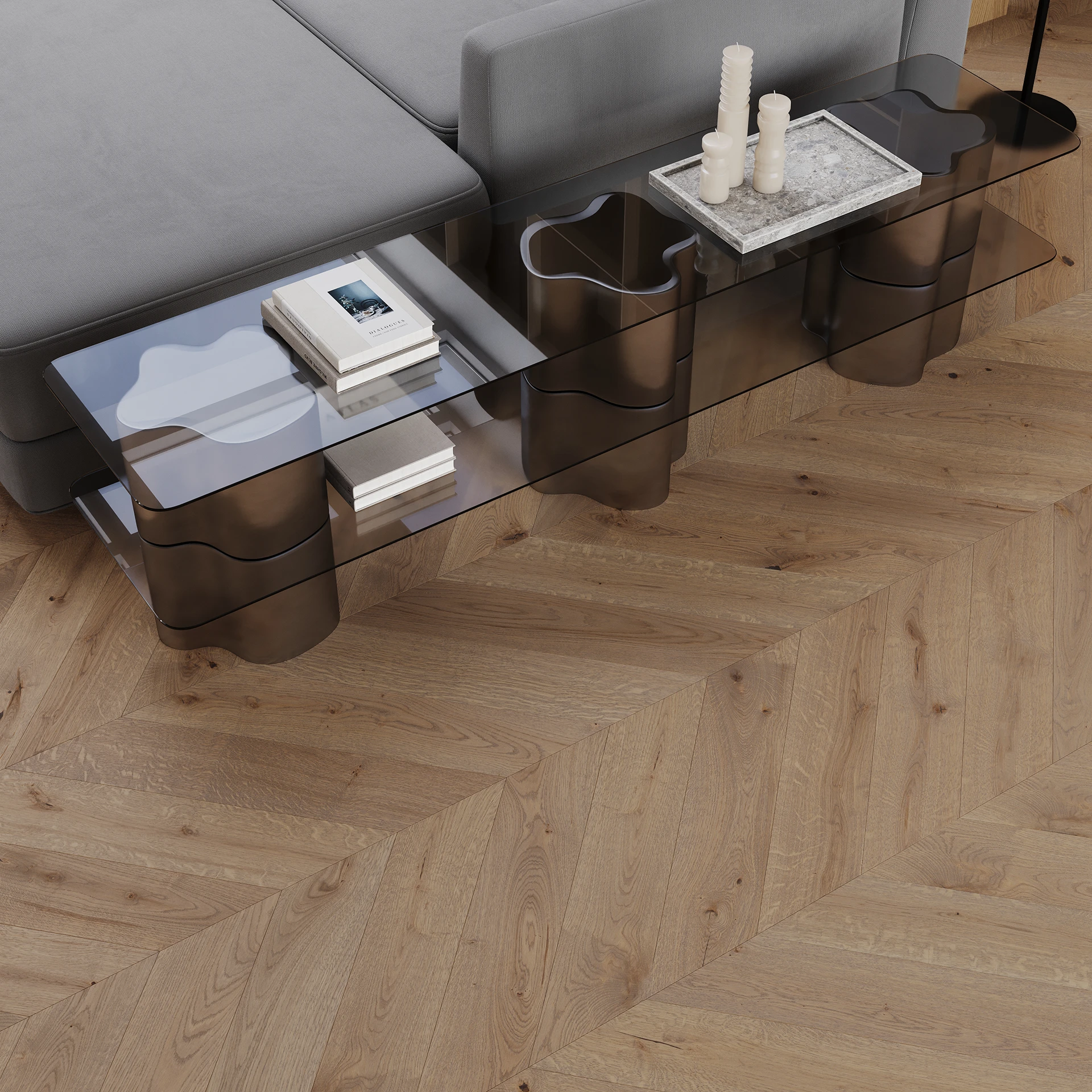 Drevená podlaha so štruktúrou výrazne zdôraznenou kartáčovaním, s množstvom prírodných vlastností dreva. 4-stranné mikroskosenie dodalo doskám noblesu. Podlaha je farbená v béžovo-šedom odtieni, ukončená matným lakom.