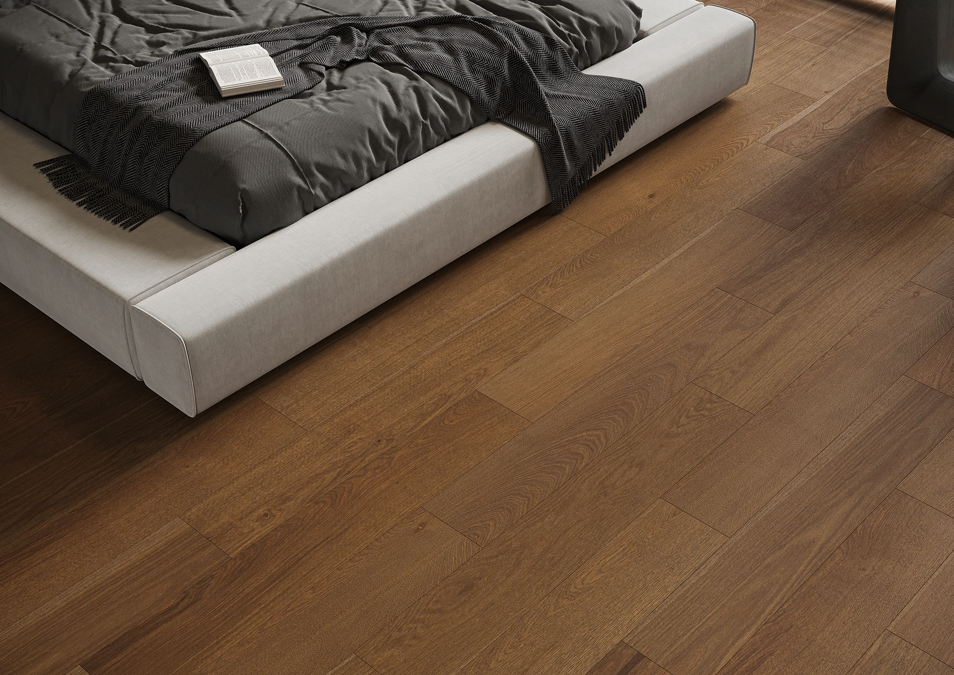 Dubová podlaha v hlbokom, hnedom odtieni očarúva eleganciou a výrazným štýlom. Intenzívna farba zvýrazňuje prirodzený vzor letokruhov, dodávajúc interiéru vznešenosť a výnimočnú hĺbku.